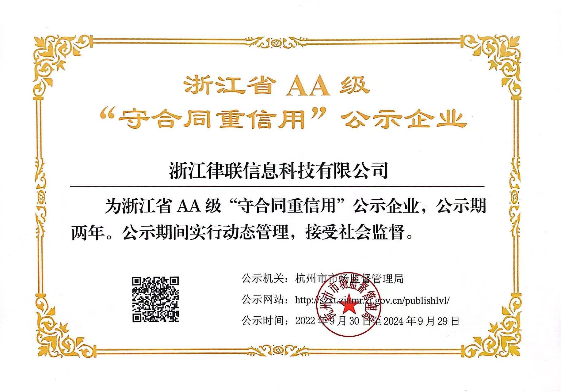 熱烈祝賀律聯(lián)科技榮獲浙江省AA級(jí)“守合同重信用”企業(yè)榮譽(yù)
