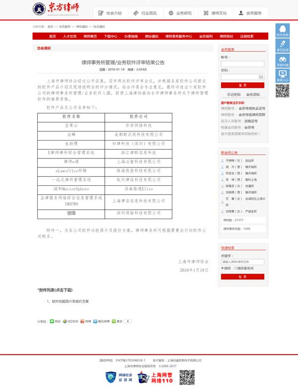 上海市律師協(xié)會(huì)經(jīng)過公開征集,召開兩次軟件評(píng)審會(huì)議,并根據(jù)各家軟件公司提交的軟件產(chǎn)品介紹及現(xiàn)場(chǎng)說明會(huì)的評(píng)分情況,結(jié)合評(píng)委會(huì)專業(yè)意見,最終評(píng)選出十家軟件公司的律師事務(wù)所管理/業(yè)務(wù)軟件入圍,獲得上海律協(xié)面向全市律師事務(wù)所關(guān)于律所管理軟件的推薦資格。