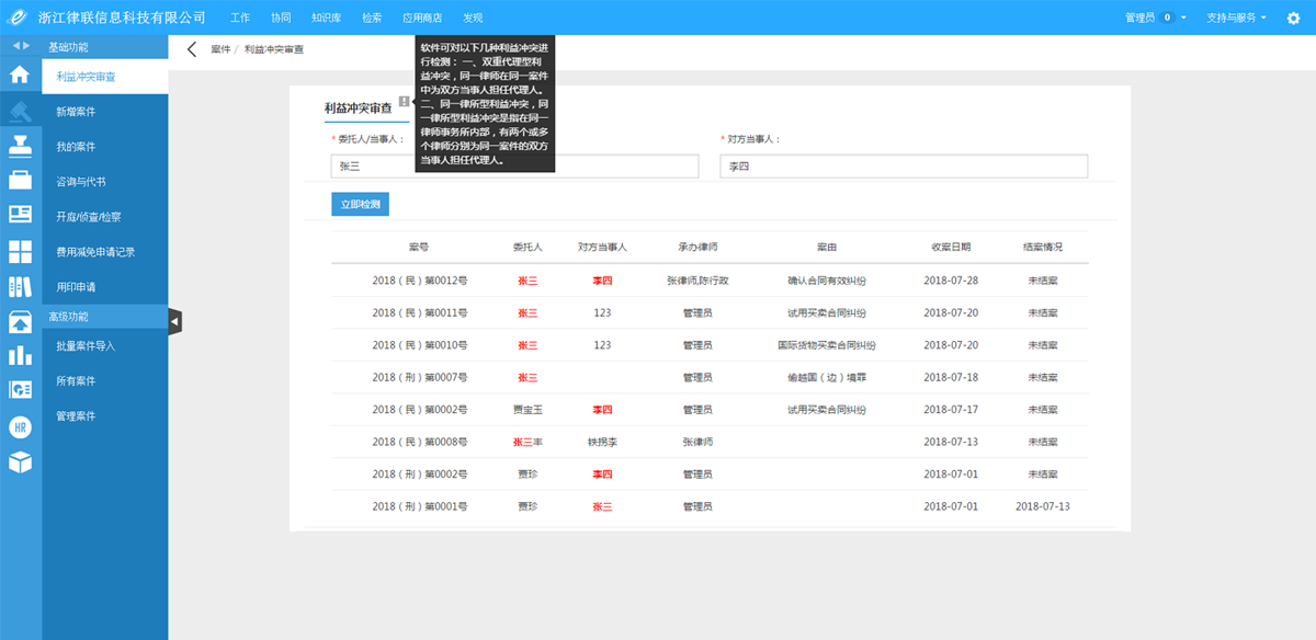 并且我們可以在系統里面設置委托人成對方當事人審查是否沖突。