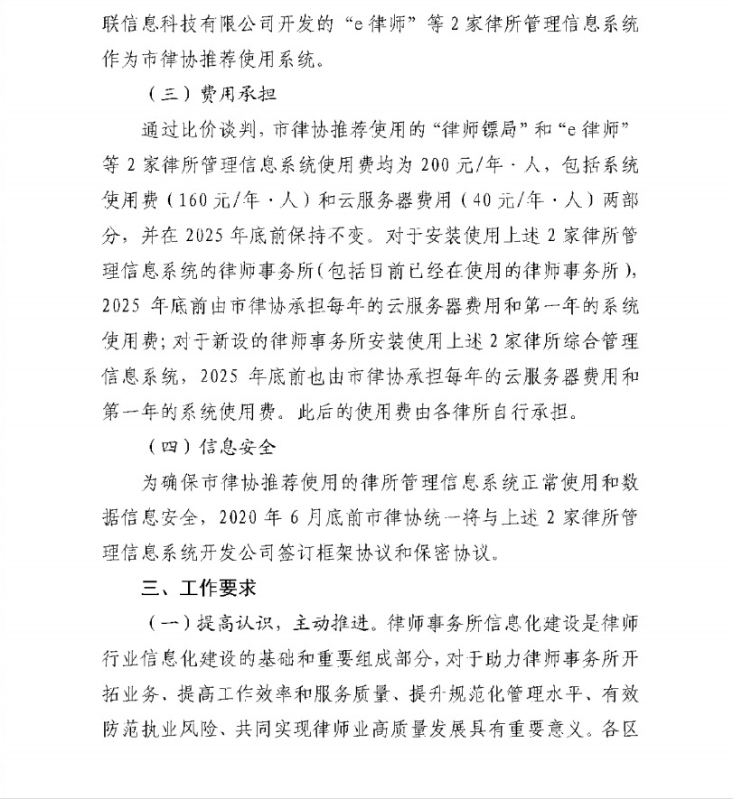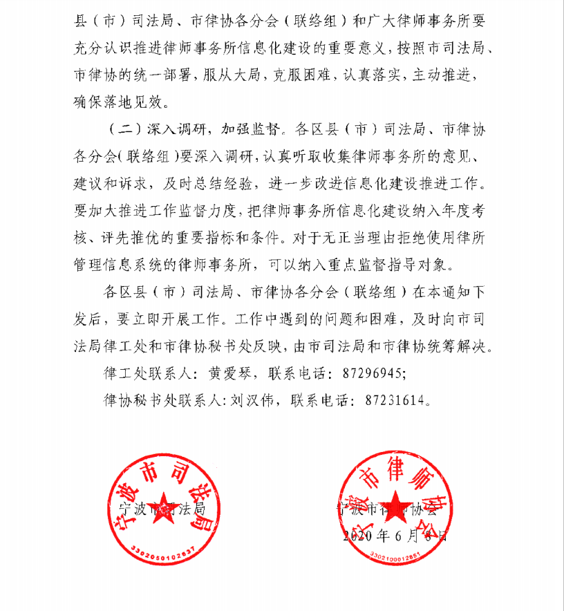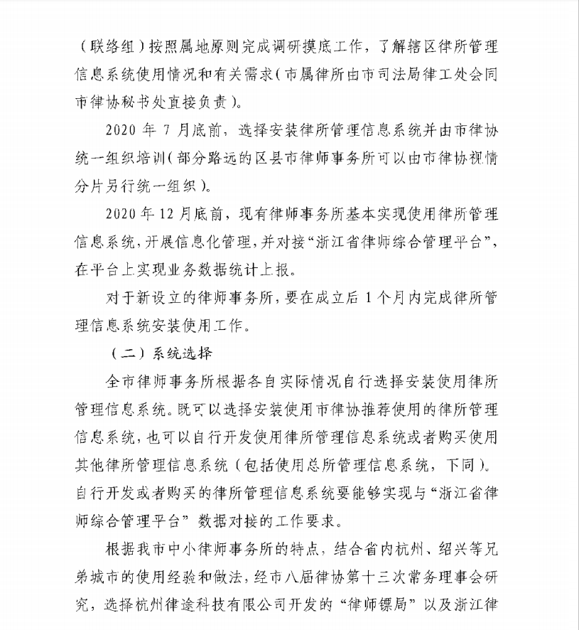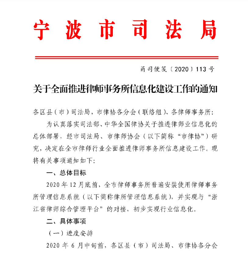 根據(jù)寧波市司法局關(guān)于全面推進(jìn)律師事務(wù)所信息化建設(shè)工作的通知,目標(biāo)將于2020年12月底前,實現(xiàn)寧波全市律師事務(wù)所普遍安裝并使用律師事務(wù)所管理信息系統(tǒng),并實現(xiàn)與“浙江省律師綜合管理平臺”的對接,初步實現(xiàn)行業(yè)信息化。